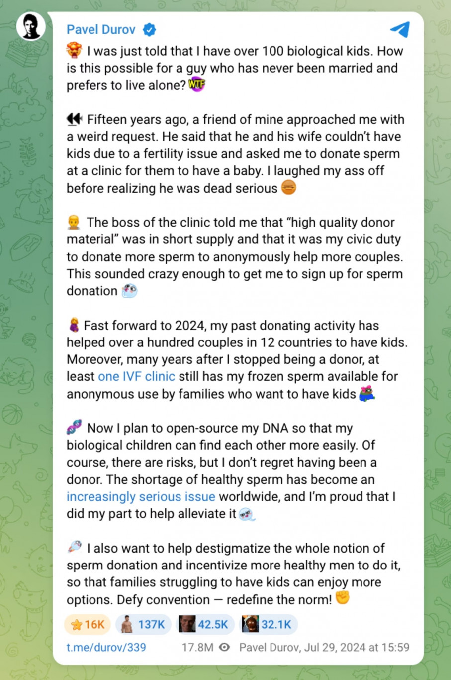 A Telegram vezetője mindenkinek kifizeti a lombikprogram költségeit, aki az ő spermáját használja hozzá