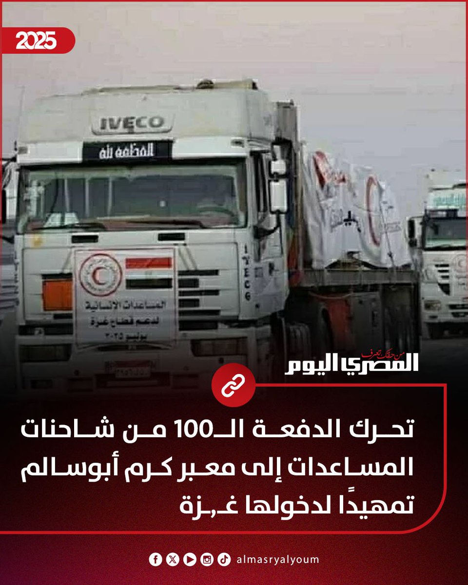 تحرك الدفعة الـ100 من شاحنات المساعدات إلى معبر كرم أبوسالم تمهيدًا لدخولها غزة