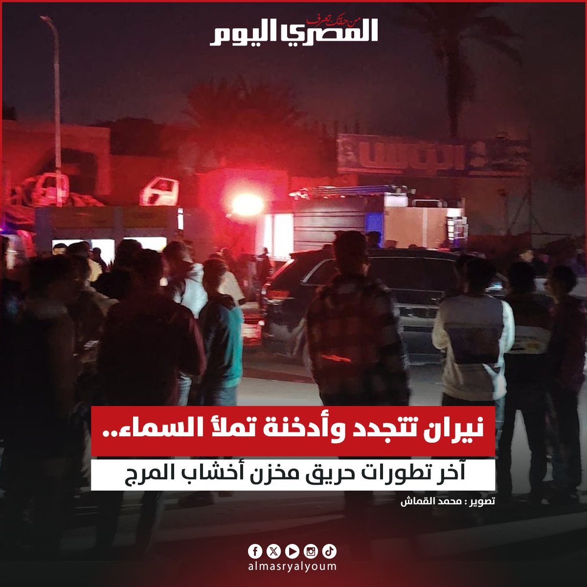 نيران تتجدد وأدخنة تملأ السماء.. آخر تطورات حريق مخزن أخشاب المرج تصوير: محمد القماش