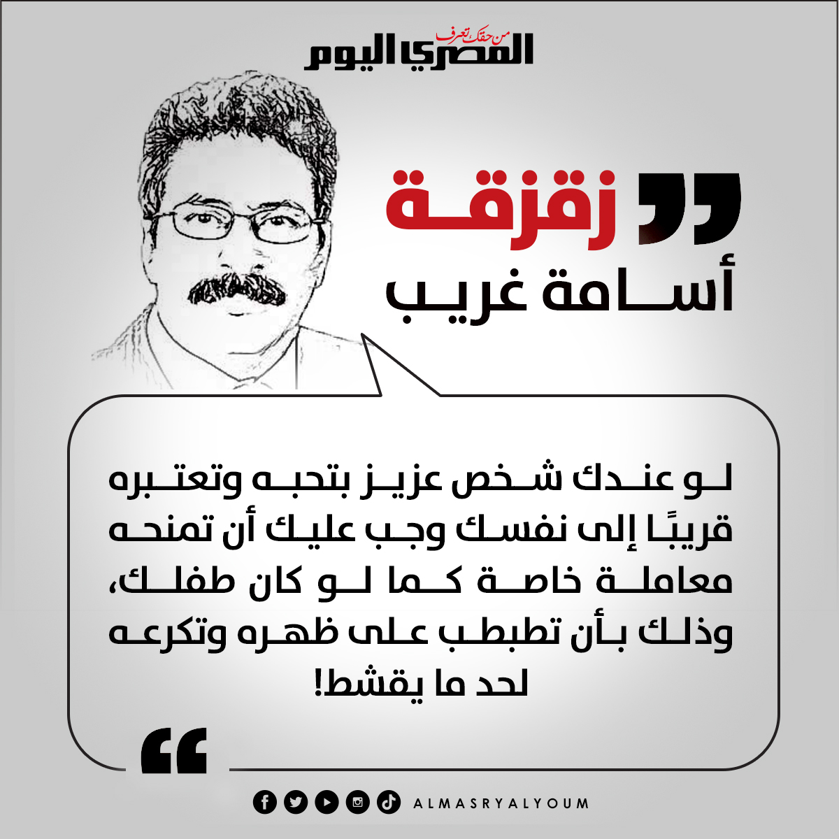 #زقزقة.. أسامة غريب: لو عندك شخص عزيز بتحبه وتعتبره قريبًا إلى نفسك وجب عليك أن تمنحه معاملة خاصة كما لو كان طفلك، وذلك بأن تطبطب على ظهره وتكرعه لحد ما يقشط!