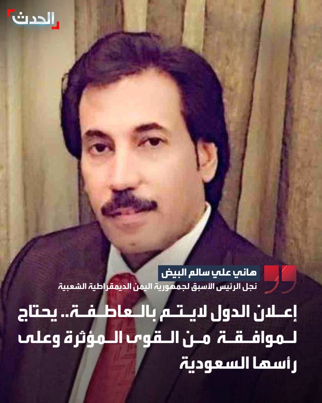 نجل الرئيس الأسبق لجمهورية اليمن الديمقراطية الشعبية هاني علي سالم البيض: إعلان الدول لا يتم بالعاطفة ولا بالإعلان المنفرد ولكن يحتاج إلى اعتراف إقليمي ودولي وتنسيق وموافقة صريحة من القوى الإقليمية المؤثرة وفي مقدمتها السعودية