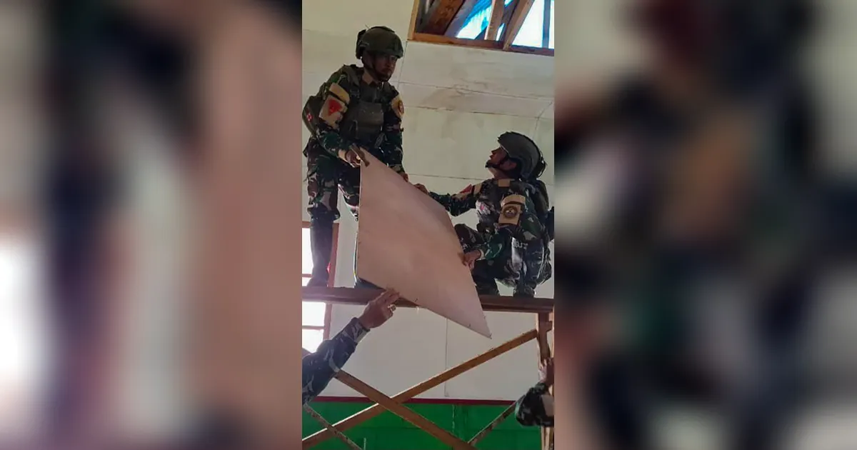 Prajurit TNI AL Satgas Pamtas RI–PNG Mobile 2025 Yonif 4 Marinir melaksanakan renovasi Gereja Katolik St. Fransiskus di Paniai, Papua, Selasa (23/12/2025).
