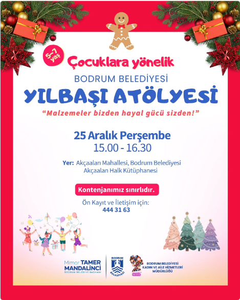 Bodrum Belediyesi, 5-7 yaş grubundaki çocuklar için Akçaalan’da yaratıcı bir “Yılbaşı Atölyesi” düzenliyor. “Malzemeler bizden, hayal gücü sizden” sloganıyla duyurulan etkinlikte çocuklar yeni yıla sanatla merhaba diyecek. BODRUM (xbodrum) – Bodrum Belediyesi, kış döneminde çocukların sosyal ve yaratıcı gelişimlerini desteklemek amacıyla gerçekleştirdiği etkinliklere bir yenisini daha ekliyor. Belediye Başkanı Tamer Mandalinci’nin öncülüğünde, Kadın ve Aile […] The post Bodrum’da Miniklere Yeni Yıl Hediyesi: Ücretsiz Yılbaşı Atölyesi Başlıyor! first appeared on Bodrum’da Bugün .