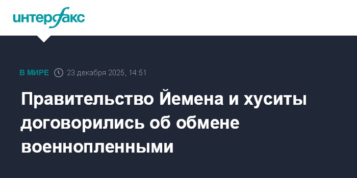 Правительство Йемена и хуситы подписали соглашение об обмене примерно 3 тысяч военнопленных, сообщают ближневосточные СМИ."Сегодня мы подписали соглашение по крупномасштабному обмену пленными: мы получим 1,7 тыс. наших людей в обмен на 1,2 тыс. бойцов другой стороны", - заявил представитель хуситов Абдулкадер аль-Мортада.