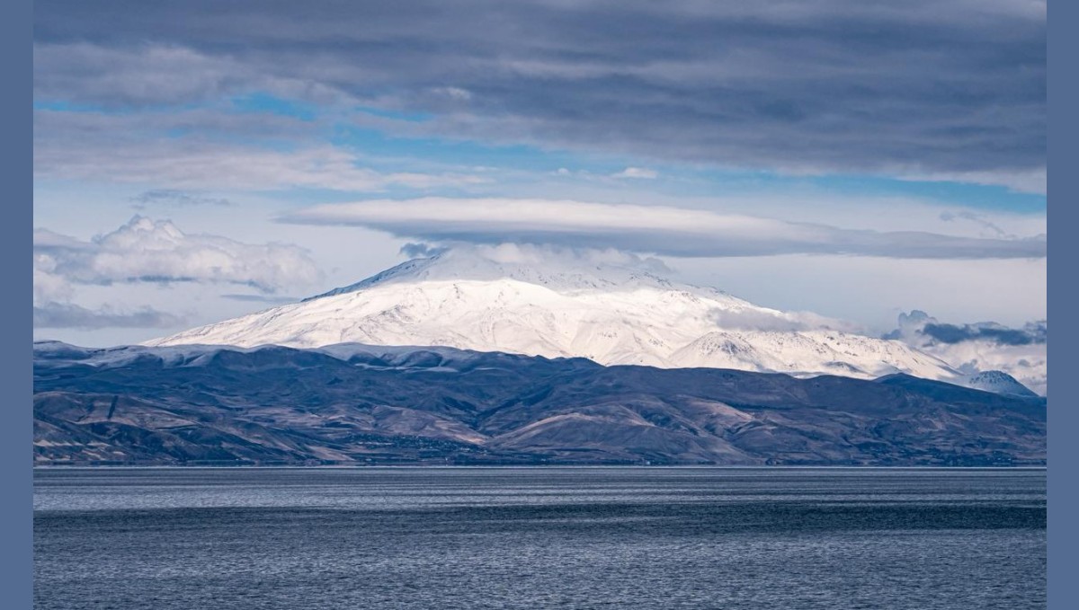 Bitlis'in Adilcevaz ilçesinde bulunan ve 4 bin 58 metre yüksekliğiyle bölgenin en görkemli dağları arasında yer alan Süphan Dağı'nın karlı zirvesinde şapka şeklinde mercek bulutu oluştu.