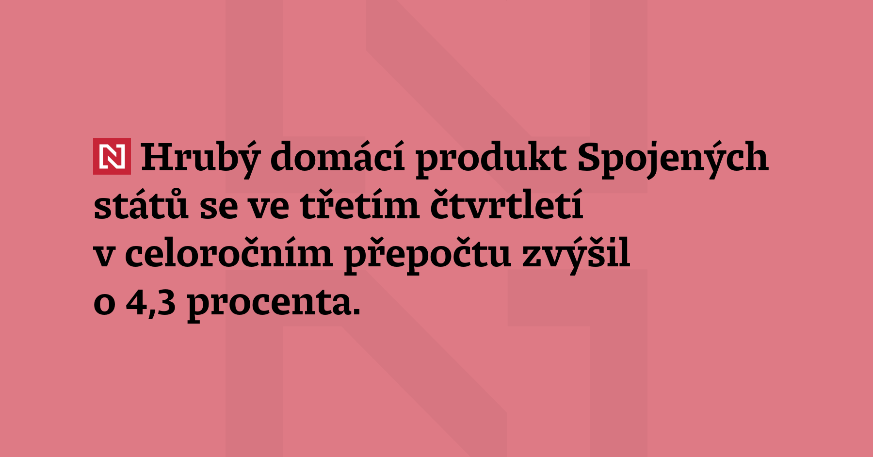 Hrubý domácí produkt Spojených států se ve třetím čtvrtletí v celoročním přepočtu zvýšil o 4,3 procenta. Růst tak překvapivě zrychlil z 3,8 procenta ve druhém čtvrtletí. Ve svém dnešním odhadu to uvedlo americké ministerstvo obchodu. Analytici podle průzkumu agentury Reuters očekávali zpomalení růstu na 3,3 procenta. Spojené státy jsou největší ekonomikou na světě. (ČTK)