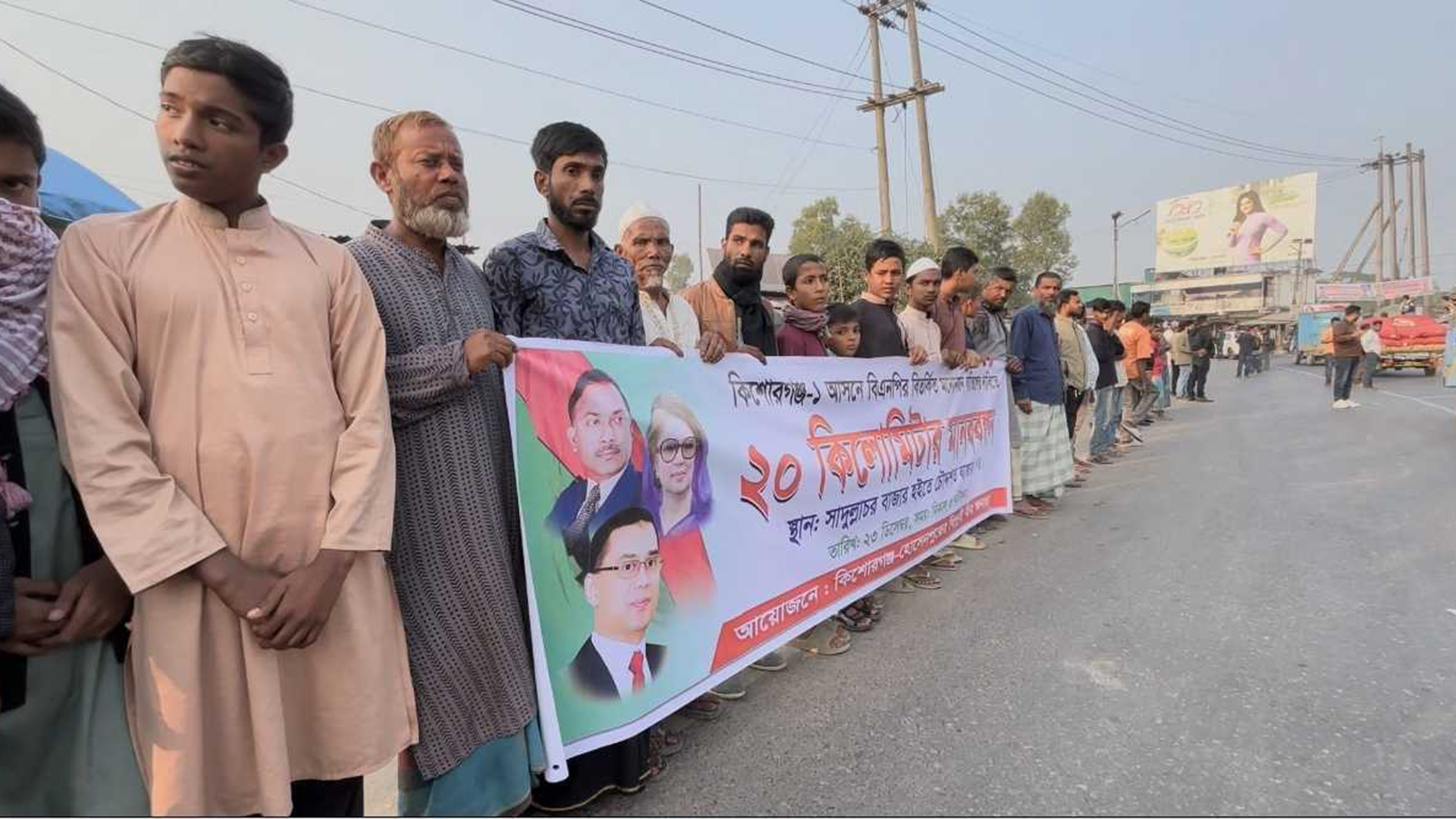 কিশোরগঞ্জ-১ আসনে ২০ কিলোমিটার এলাকাজুড়ে মানববন্ধন ও বিক্ষোভ কর্মসূচি পালন করেছেন বিএনপির মনোনয়নবঞ্চিত পাঁচ প্রার্থী ও তাদের হাজারো সমর্থক। এতে ভৈরব-ময়মনসিংহ আঞ্চলিক মহাসড়কে তীব্র যানজটের সৃষ্টি হয়।মঙ্গলবার (২৩ ডিসেম্বর) দুপুর থেকে ভৈরব ময়মনসিংহ আঞ্চলিক মহাসড়কের বিভিন্ন পয়েন্টে একযোগে এ মানববন্ধন ও বিক্ষোভ কর্মসূচি পালন করে কঠোর আন্দোলনের হুঁশিয়ারি দেয়া হয়। এ দিকে দীর্ঘ প্রায় ২০ কিলোমিটার এলাকাজুড়ে চলা এই কর্মসূচিতে অংশ নেন: বিএনপির সাবেক সংসদ সদস্য মাসুদ হিলালী, সাবেক বিচারক ও জেলা বিএনপির সাবেক সহ-সভাপতি রেজাউল করিম খান চুন্নু, সদর উপজেলা বিএনপির সভাপতি খালেদ সাইফুল্লাহ সোহেল, সাবেক সহ-সভাপতি রুহুল হুসাইন এবং অ্যাডভোকেট শরিফুল ইসলাম।আরও পড়ুন: ঢাকা-ভাঙ্গা এক্সপ্রেসওয়ে অবরোধ বিএনপির মনোনয়নবঞ্চিত প্রার্থীর সমর্থকদেরএ সময় নেতারা মনোনয়নপ্রাপ্ত প্রার্থীর বিরুদ্ধে নানা অনিয়ম ও দুর্নীতির অভিযোগ তুলে দ্রুত মনোনয়ন বাতিলের দাবি জানান। দাবি মানা না হলে কঠোর কর্মসূচির হুঁশিয়ারিও দেন তারা।বিকেল সাড়ে ৫টায় কর্মসূচি সাময়িকভাবে শেষ করা হয়। তবে আগামীকাল রেলপথে অবস্থান কর্মসূচি পালনের ঘোষণা দেন আন্দোলনকারীরা।উল্লেখ্য, দ্বিতীয় দফায় বিএনপি কিশোরগঞ্জ–১ আসনে জেলা কমিটির সাধারণ সম্পাদক মাজহারুল ইসলামকে মনোনীত প্রার্থী হিসেবে ঘোষণা করা হয়। এরপর থেকেই মনোনয়ন বাতিল দাবিতে চলছে লাগাতার আন্দোলন কর্মসূচি।