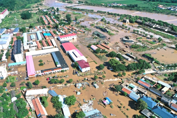 2025年夏季,中国北方遭遇历史性暴雨。7月28日,北京市密云区太师屯镇一养老照料中心遭洪水围困,31名老人遇难。图为7月29日拍摄的密云区遭遇洪水后的鸟瞰图。(Adek Berry/AFP via Getty Images)