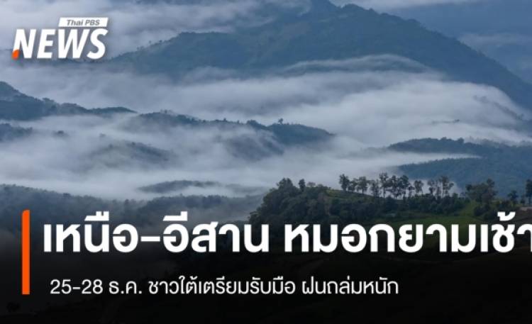 วันนี้ (24 ธ.ค.2568) กรมอุตุนิยมวิทยา พยากรณ์อากาศ 24 ชั่วโมงข้างหน้า ประเทศไทยตอนบนจะมีอุณหภูมิสูงขึ้นเล็กน้อย แต่ยังคงมีอากาศเย็นกับมีหมอกบางในตอนเช้า เนื่องจากบริเวณความกดอากาศสูงหรือมวลอากาศเย็นที่ปกคลุมประเทศไทยตอนบนและทะเลจีนใต้มีกำลังอ่อน บริเวณยอดดอยมีอากาศหนาวถึงหนาวจัดและมีน้ำค้างแข็งบางแห่ง ส่วนยอดภูมีอากาศหนาว ขอให้ประชาชนดูแลรักษาสุขภาพเนื่องจากสภาพอากาศที่เปลี่ยนแปลงไว้ด้วย สำหรับภาคใต้มีฝนน้อย แต่ยังคงมีฝนฟ้าคะนองบางแห่งทางตอนล่างของภาค เนื่องจากมรสุมตะวันออกเฉียงเหนือที่พัดปกคลุมอ่าวไทย และภาคใต้มีกำลังอ่อน ส่วนคลื่นลมบริเวณอ่าวไทยตอนล่างมีคลื่นสูง 1-2 เมตร บริเวณที่มีฝนฟ้าคะนองคลื่นสูงมากกว่า 2 เมตร ขอให้ชาวเรือบริเวณอ่าวไทยและทะเลอันดามันเดินเรือด้วยความระมัดระวัง และหลีกเลี่ยงการเดินเรือในบริเวณที่มีฝนฟ้าคะนองไว้ด้วย อนึ่ง ในช่วงวันที่ 25–28 ธ.ค.2568 ภาคใต้จะมีฝนเพิ่มขึ้นและมีฝนตกหนักถึงหนักมากบางแห่งทางตอนล่างของภาค เนื่องจากมรสุมตะวันออกเฉียงเหนือที่พัดปกคลุมบริเวณอ่าวไทย ภาคใต้ และทะเลอันดามันจะมีกำลังแรงขึ้น ขอให้ประชาชนบริเวณภาคใต้ตอนล่างระวังอันตรายจากฝนตกหนักถึงหนักมากและฝนที่ตกสะสม ฝุ่นละอองในระยะนี้ บริเวณภาคกลางรวมทั้งกรุงเทพมหานครและปริมณฑลมีการสะสมของฝุ่นละออง/หมอกควันอยู่ในเกณฑ์ปานกลางถึงค่อนข้างมาก เนื่องจากมีการระบายอากาศไม่ดี ในขณะที่บริเวณภาคอื่นๆ ยังคงมีการสะสมของฝุ่นละออง/หมอกควันอยู่ในเกณฑ์ดีถึงปานกลาง พยากรณ์อากาศสำหรับประเทศไทย ภาคเหนือ อากาศเย็นถึงหนาวกับมีหมอกในตอนเช้า อุณหภูมิต่ำสุด 15-21 องศาเซลเซียส อุณหภูมิสูงสุด 28-34 องศาเซลเซียส บริเวณยอดดอยอากาศหนาวถึงหนาวจัดกับมีน้ำค้างแข็งบางแห่ง อุณหภูมิต่ำสุด 4-12 องศาเซลเซียส ลมตะวันออก ความเร็ว 10-15 กม./ชม. ภาคตะวันออกเฉียงเหนือ อากาศเย็นกับมีหมอกบางในตอนเช้า อุณหภูมิต่ำสุด 18-22 องศาเซลเซียส อุณหภูมิสูงสุด 31-34 องศาเซลเซียส บริเวณยอดภูอากาศหนาว อุณหภูมิต่ำสุด 10-14 องศาเซลเซียส ลมตะวันออกเฉียงเหนือ ความเร็ว 10-20 กม./ชม. ภาคกลาง อากาศเย็นกับมีหมอกบางในตอนเช้า และอุณหภูมิจะสูงขึ้นเล็กน้อย อุณหภูมิต่ำสุด 19-23 องศาเซลเซียส อุณหภูมิสูงสุด 33-34 องศาเซลเซียส ลมตะวันออกเฉียงเหนือ ความเร็ว 10-20 กม./ชม. ภาคตะวันออก อากาศเย็นกับมีหมอกบางในตอนเช้า และอุณหภูมิจะสูงขึ้นเล็กน้อย อุณหภูมิต่ำสุด 20-25 องศาเซลเซียส อุณหภูมิสูงสุด 33-35 องศาเซลเซียส ลมตะวันออกเฉียงเหนือ ความเร็ว 15-30 กม./ชม. ทะเลมีคลื่นสูงประมาณ 1 เมตร ภาคใต