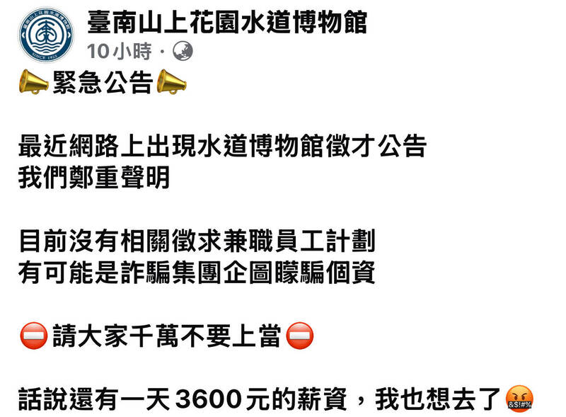每年農曆春節,台南山上花園水道博物館都會吸引許多民眾走春,近日有民眾發現,網路社群上有詐騙集團假冒館方「招募春節市集兼職員工」,甚至開出「時薪400還有額外紅包」的誘人薪資,企...…