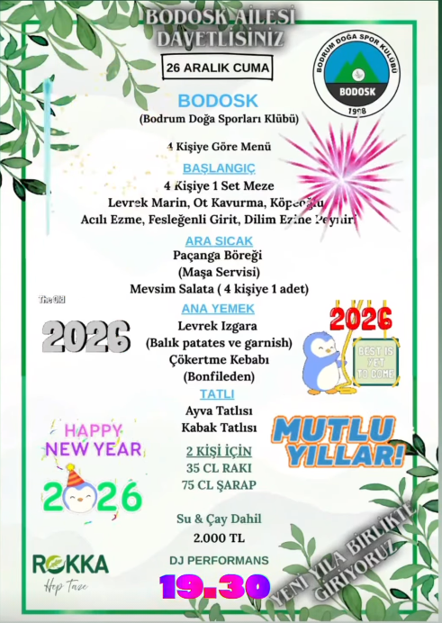 Bodrum Doğa Sporları Kulübü (BODOSK), 2026 yılına merhaba demek için özel bir gece düzenliyor. Rokka Bodrum’un ev sahipliğinde gerçekleşecek olan yılbaşı yemeği, zengin menüsü ve DJ performansıyla doğaseverleri bir araya getirecek. BODRUM – Bodrum’un en aktif sivil toplum kuruluşlarından biri olan Bodrum Doğa Sporları Kulübü (BODOSK), geleneksel yılbaşı buluşmasını bu yıl 26 Aralık Cuma akşamı […] The post Bodrum’da Doğa ve Eğlence Buluşuyor: BODOSK 2026 Yılbaşı Galası Rokka’da! first appeared on Bodrum’da Bugün .