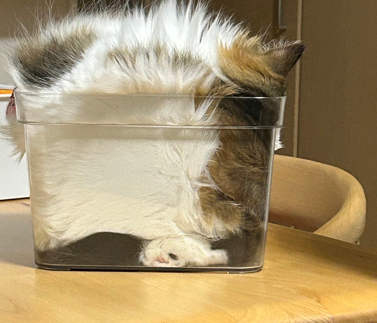 「圧縮タオルみたいな猫ね (水入れると膨らむやつ)」というコメントとともに、透明のケースにみっちり収まる猫の姿を投稿したのは、✳︎なごみ処✳︎あずきち&こむぎさん( @azukichi_komugi )。 写っているのは、オス猫のこむぎ。性格は「猪突猛進」で、どんな箱や隙間にも果敢に挑むタイプだといいます。 投稿者いわく、「“猫は液体”を体現する箱猫です」とのことで、こむぎは毎日なにかしらのケースに入り、そこで毛づくろいや睡眠、さらには喧嘩までこなすのだそうです。ときには「こんなところに?」という場所から視線を感じることもあり、驚かされることが多いと話します。 今回のケースは、投稿者が買い物中「こむぎが入りそう」と思わず手に取ってしまい、プレゼントとして迎え入れたといいます。 あまりにも綺麗な収まりぶりに、投稿には「食パン」「頭どこ…?」「これ、どうなってんの?」といった驚きの声がたくさん寄せられました。 【画像】 まさかこの状態で喧嘩も…? 【あわせて読みたい】 やはり猫は液体。キャットタワーの猫が「ろくろ首」「ネッシーならぬニャッシー」だった Related... 【画像】【猫は液体】透明ケースに“みちみち”に収まる猫⇨「圧縮タオルみたい」「食パン」と話題に “魚革”の名刺入れ、届いてみたら…中にはぎっしり⇒「すごいサスティナブル」「出汁とれるしええな」 雪を見るとテンション爆上がり!で、頭から…⇒冬を満喫する柴犬の行動に「犬拓がどんなか見たい」の声 ...クリックして全文を読む