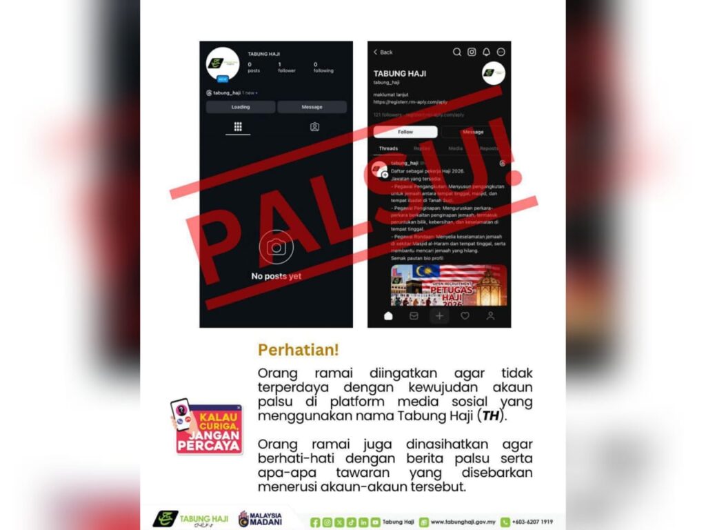PETALING JAYA – Lembaga Tabung Haji (TH) telah mengesan beberapa akaun palsu yang menggunakan nama syarikat itu di platform media sosial. Menerusi satu kenyataan di laman Facebooknya, TH berkata, akaun-akaun tersebut turut dikenal pasti menyebarkan tawaran palsu dan berita tidak benar. “Sebagai langkah berjaga-jaga, TH telah membuat laporan rasmi bagi tujuan menyahaktifkan akaun-akaun tersebut,”ujarnya.-KOSMO! ONLINE The post TH nyahaktif akaun palsu di media sosial appeared first on Kosmo Digital .