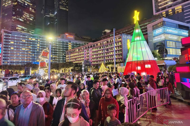 Ratusan warga memadati kawasan Bundaran Hotel Indonesia (HI), Jakarta Pusat, untuk menikmati Jakarta Light Festival ...