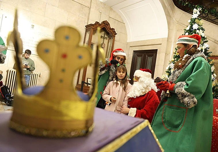 Santa Claus, que entra por la chimeneas en Nochebuena para dejar los regalos, ha recibido a los niños que le han aclamado a las puertas del Ayuntamiento, tras desconvocarse el paseo por las calles de Oviedo a causa del mal tiempo
