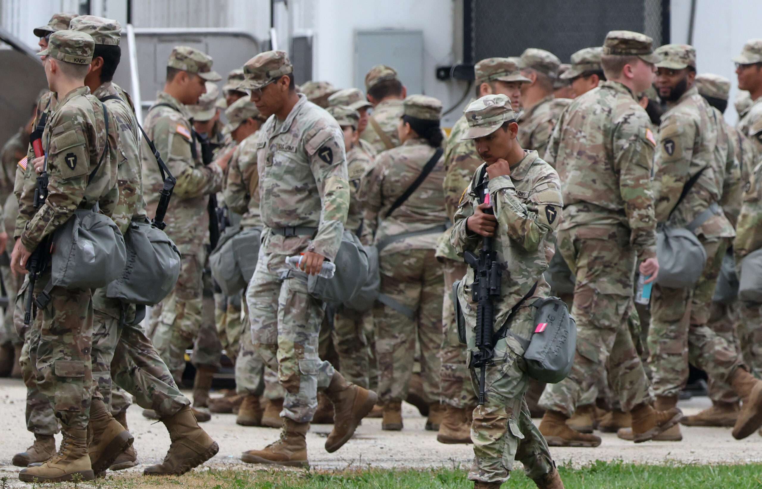 Members of the Texas National Guard assemble at the Army Reserve Training Center in Elwood, Illinois