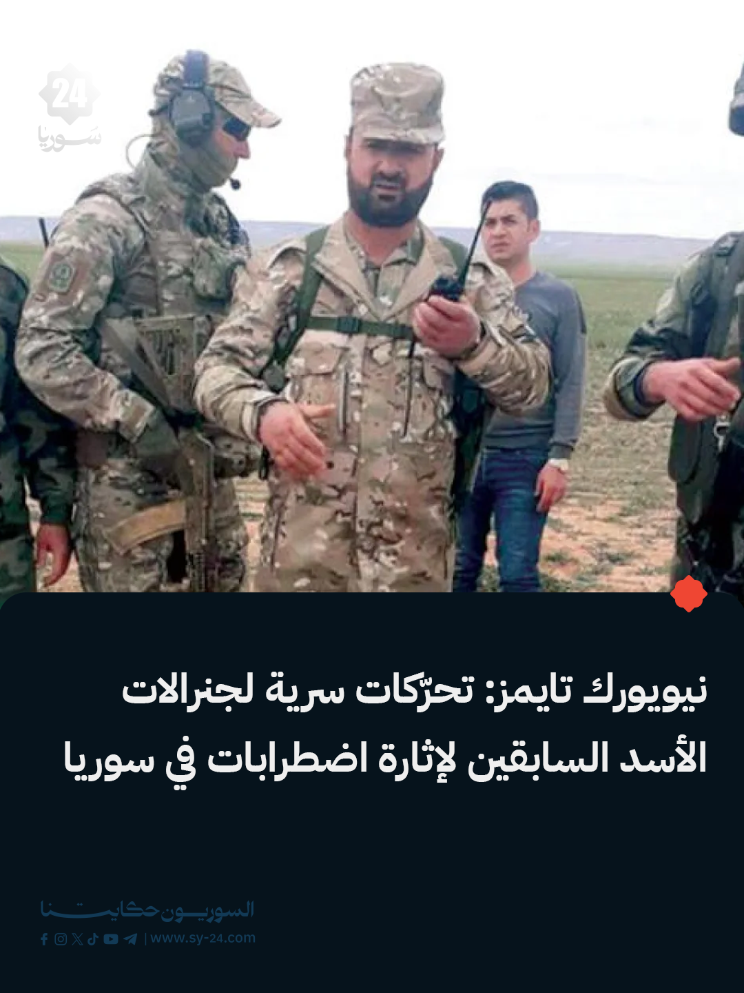 نيويورك تايمز: جنرالات الأسد السابقون يقودون تحرّكات سرية من منفاهم لإشعال اضطرابات مسلحة داخل سوريا سهيل الحسن، قائد “قوات النمر” سابقاً، ضمن الشبكة المتورطة في هذه التحركات اللواء كمال حسن، الرئيس السابق لشعبة المخابرات العسكرية، يشارك في هذه الأنشطة رامي مخلوف يموّل الشبكة عبر منح نقدية لعائلات في الساحل لضمان الولاء The post جنرالات الأسد السابقون يقودون تحرّكات سرية من منفاهم لإشعال اضطرابات مسلحة داخل سوريا appeared first on SY24 .