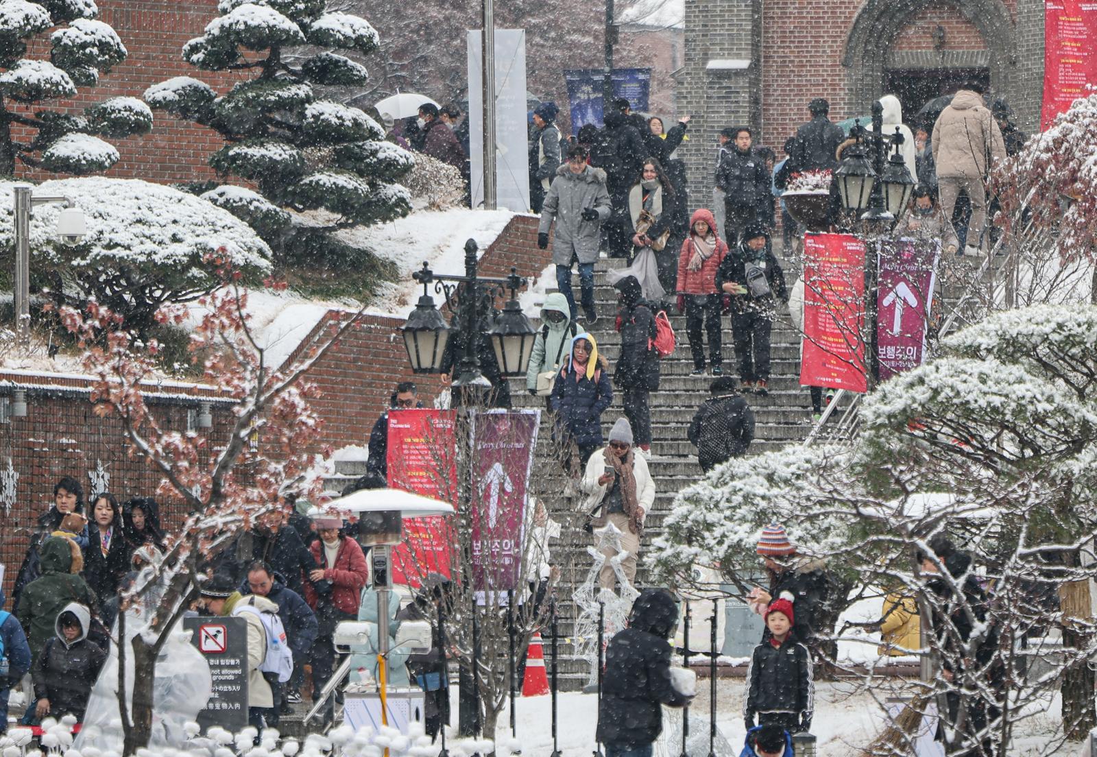 성탄절인 25일 북서쪽에서 찬 공기가 내려오면서 대부분의 지역이 영하권에 들겠다. 전라·서해안 지역을 중심으로 많은 눈이 내리겠다. 25일 기상청에 따르면 이날 전국이 대체로 맑겠으나 충남권과 전라권, 제주에는 구름이 많겠다. 아침 최저기온은 -8~3도, 낮 최고기온은 -4~8도로 예보됐다. 특히 전라 서해안을 중심으로 많은 눈이 내리겠다. 전북 서해안과 남부 내륙, 전남 서해안에는 3~8㎝, 많은 곳은 전북 서해안에서 10㎝ 이상의 눈이 쌓이겠다. 광주와 전남 서부는 1~5㎝, 충남 서해안은 1~5㎝, 세종과 충남 북부 내륙, 충북 중·남부는 1~3㎝ 수준의 적설이 예보됐다. 서해5도에도 1㎝ 안팎의 눈이 내리겠다. 제주도 산지에는 대설 예비특보가 발표됐다. 특보 발효 시간은 낮 12시부터 오후 6시까지다.예상 적설량은 제주도 산지 5~10㎝(많은 곳 15㎝ 이상), 제주도 중산간 2~7㎝다.25~26일 예상 적설량은 울릉도·독도 10~30㎝, 전북 서해안·남부 내륙, 전남