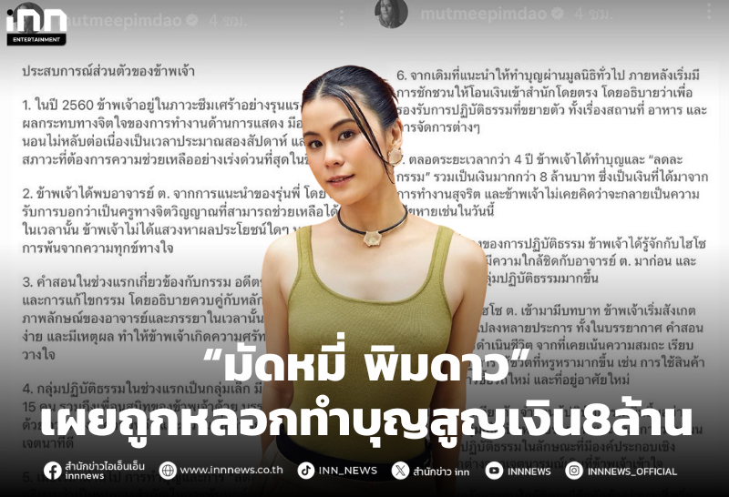 สะเทือนวงการ! “มัดหมี่ พิมดาว” แชร์ประสบการณ์ ถูกหลอกทำบุญสูญเงิน8ล้าน “ไฮโซ ต.”มีส่วนเอี่ยว เพราะรู้จักเจ้าสำนัก