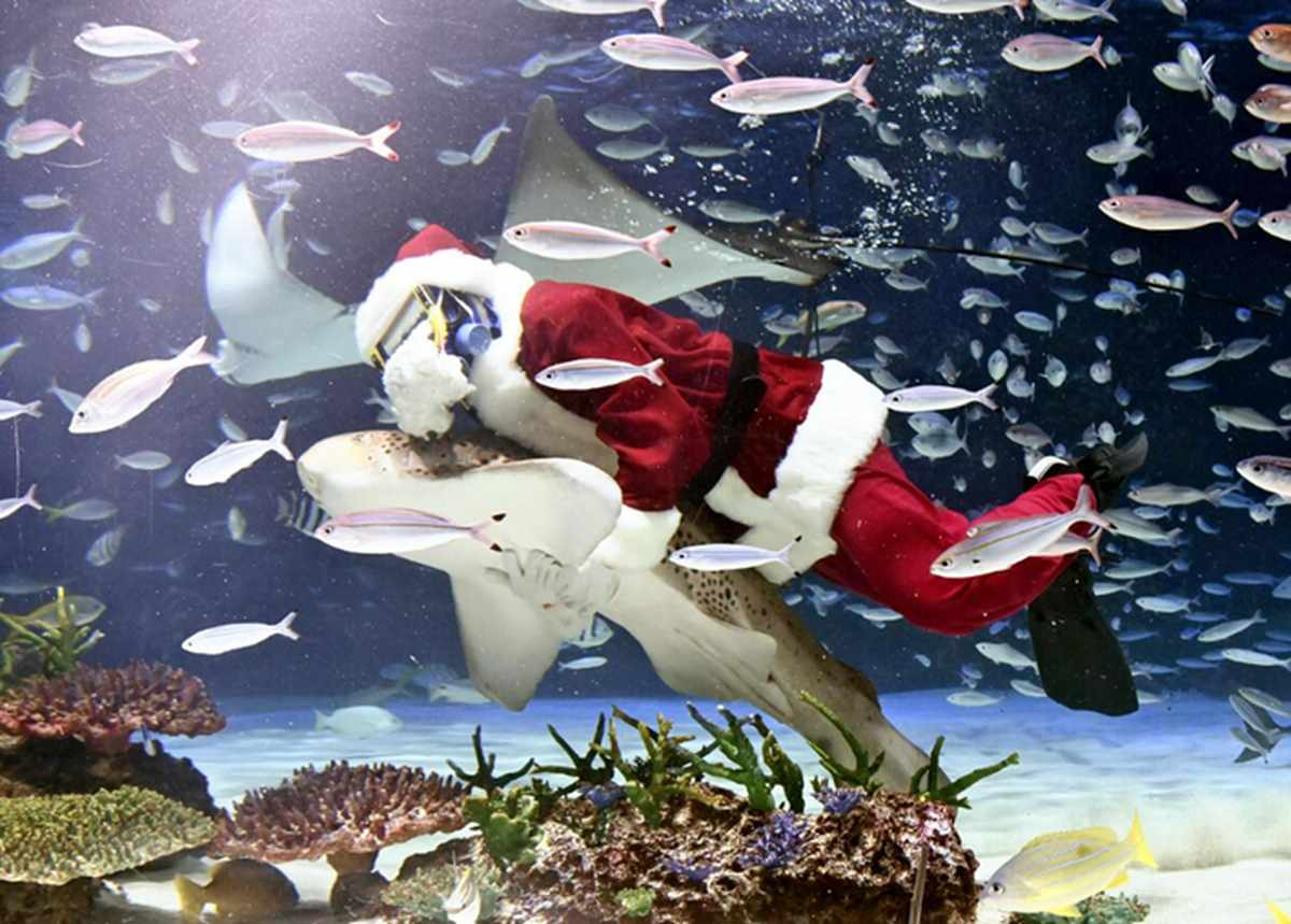 A diver wearing Santa Claus costume dove into an aquarium tank to feed fish and marine animals at the Sunshine Aquarium in Toshima, Tokyo, on Tuesday.