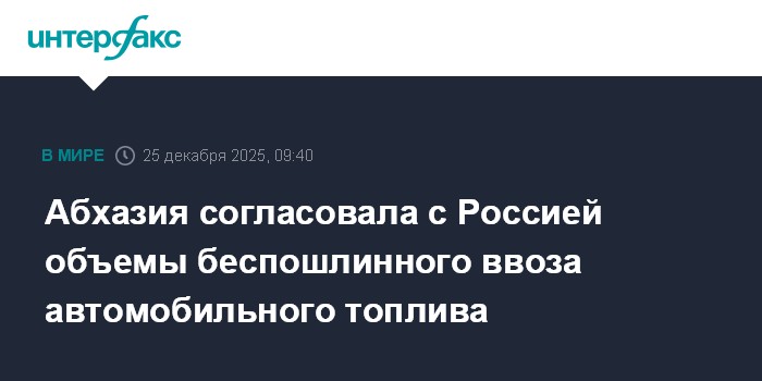 Россия и Абхазия согласовали объемы беспошлинного вывоза нефтепродуктов из РФ для внутреннего потребления в Абхазии в 2026 году, сообщает пресс-служба министерства энергетики республики.