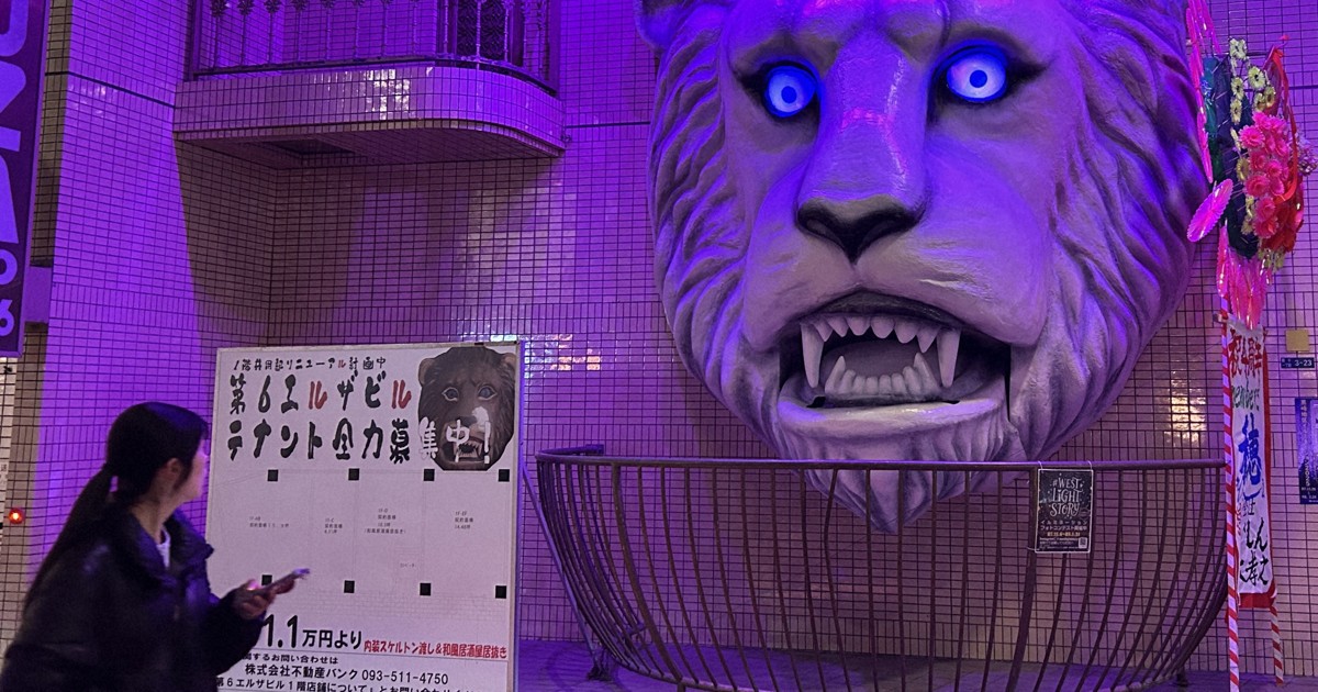 商店街見守るライオン像 ライトアップであやしげな表情に 北九州