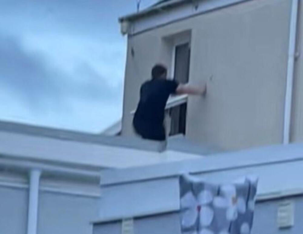 Prema snimku, muškarac najpre iskače kroz prozor, potom trči preko krova niže zgrade pokušavajući da pobegne