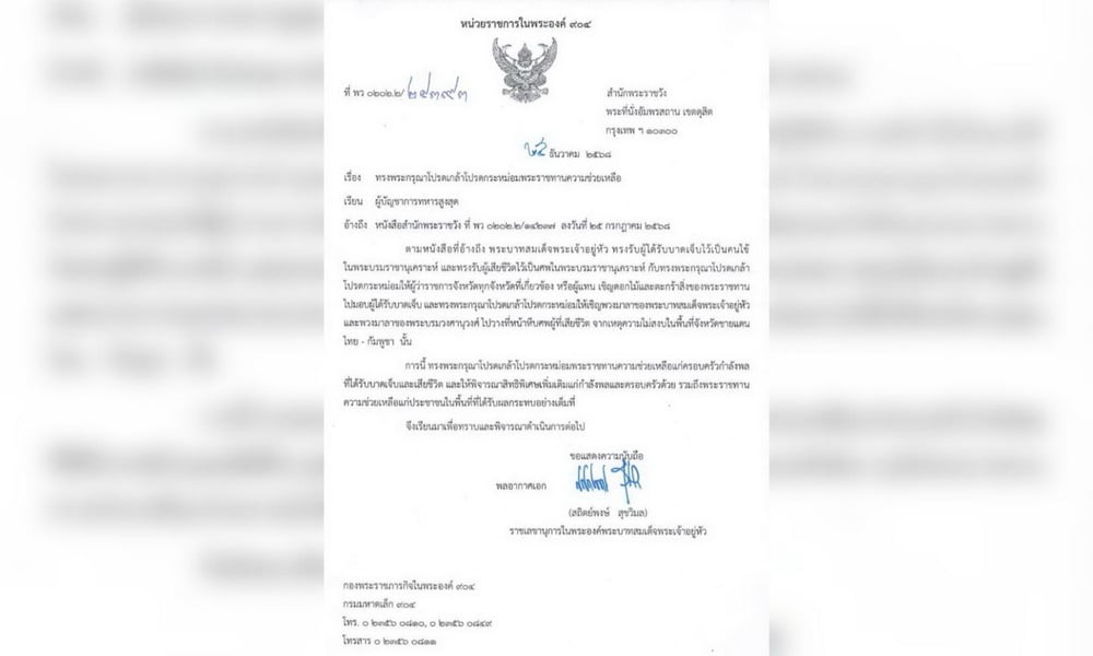 พระเจ้าอยู่หัวฯพระราชทาน ความช่วยเหลือแก่กำลังพล-ประชาชนในพื้นที่ชายแดนไทย-กัมพูชาที่ได้รับผลกระทบจากการสู้รบ พร้อมให้พิจารณาสิทธิพิเศษเพิ่มเติมแก่ทหาร-ครอบครัวที่ได้รับบาดเจ็บและเสียชีวิต The post ในหลวง โปรดเกล้าฯ พระราชทานความช่วยเหลือแก่กำลังพล-ประชาชนในพื้นที่ชายแดน appeared first on .