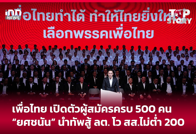 พรรคเพื่อไทย เปิดตัวผู้สมัคร สส.แบบแบ่งเขต และแบบบัญชีรายชื่อ ครบ 500 คน โดย “ยศชนัน” แคนดิเดตนายกลำดับที่ 1 ประกาศนำทัพสู้ศึกเลือกตั้ง ขณะ “สุริยะ” มั่นใจกวาด สส. ไม่ต่ำกว่า 200 ที่นั่ง ด้าน “จุลพันธ์” ลั่นความพร้อมลงมือทำ ชูนโยบาย 3 เสาหลัก พาประเทศเดินหน้า ย้ำ มีแต่เพื่อไทยที่ทำได้