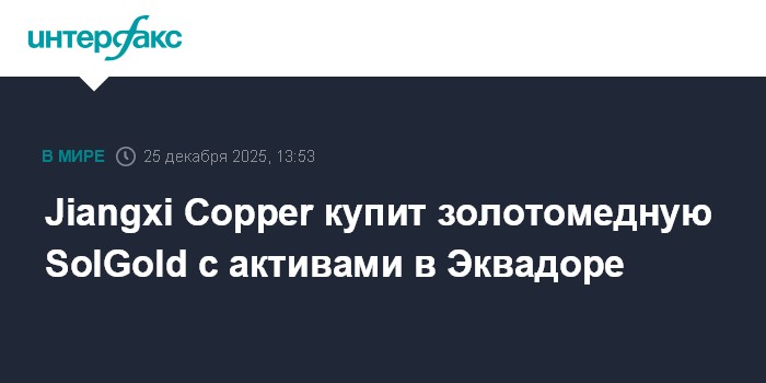 Крупнейший производитель меди в Китае Jiangxi Copper Co. договорился о покупке золотомеднодобывающей компании SolGold Plc с активами в Эквадоре с оплатой денежными средствами.Jiangxi Copper заплатит по 28 пенсов за акцию SolGold, говорится в сообщении китайской компании.