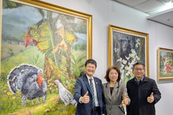 嘉义大学校长林翰谦(左1)、图书资讯处处长林土量(右1)参观展览。(嘉义大学提供)