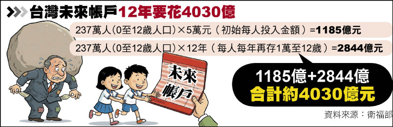在野黨方案缺少差異化設計 需全面審慎評估 〔記者林志怡/台北報導〕國民黨與民眾黨昨召開記者會,提出「台灣未來帳戶特別條例草案」,主張為〇至十二歲孩子每年存一萬元投資,十八歲即可使用。衛福部直言,以在野黨的方案估算,初期經費就超過一一八五億元,政府資源有限,應優先照顧更需要支持的孩子,在野黨方案卻缺…
