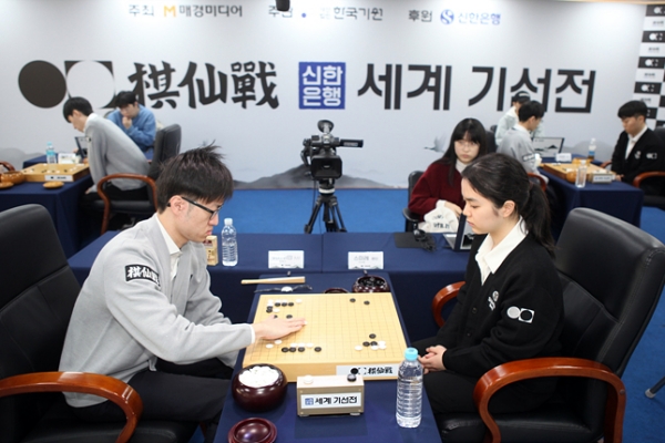 2025年12月25日,第一届“新韩银行世界棋仙战”首轮在首尔韩国棋院战罢,持外卡参赛的韩国棋院客座棋士仲邑堇四段(前右),爆冷击败日本“令和三羽乌”之一的许家元九段(前左),晋级十六强。(cyberoro.com提供)
