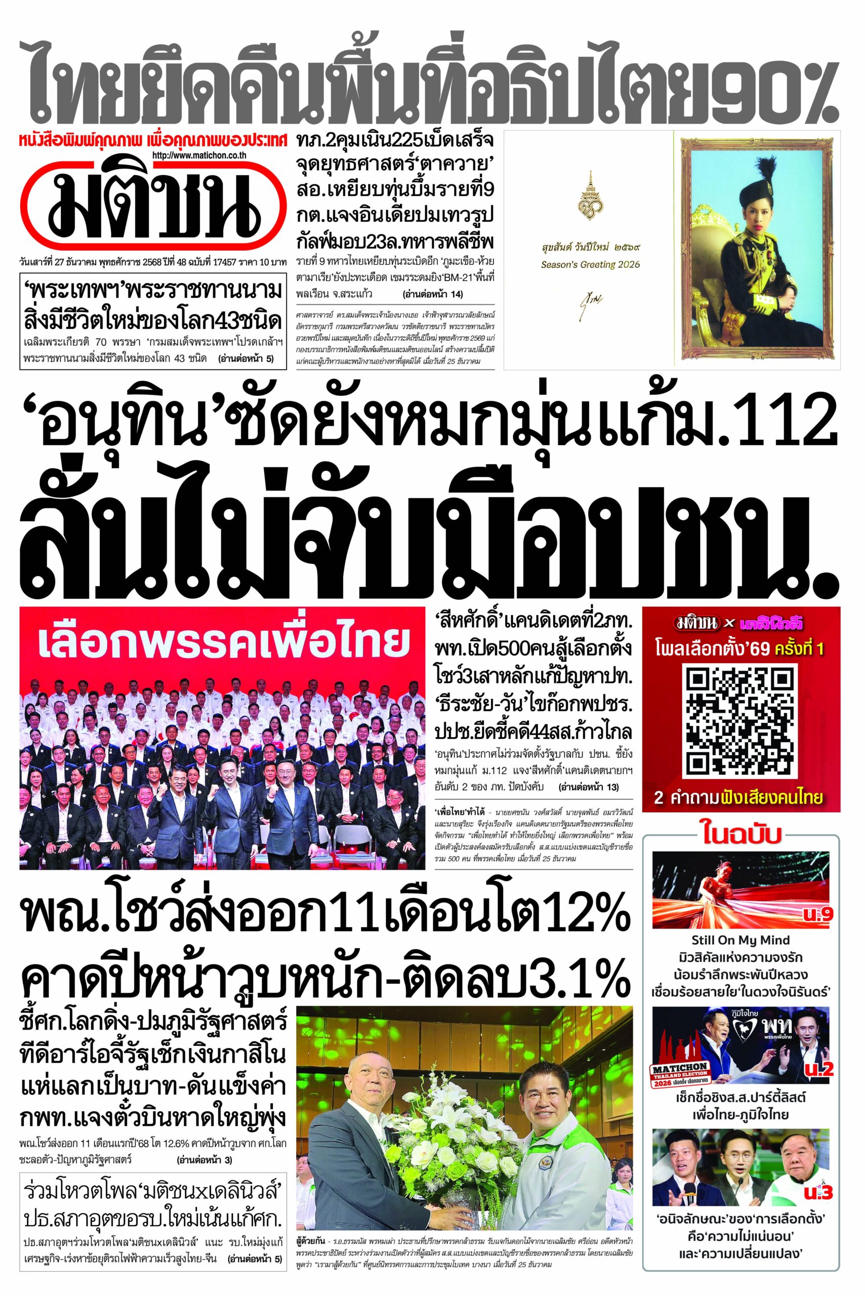 หน้า 1 หนังสือพิมพ์มติชนรายวัน ฉบับวันเสาร์ที่ 27 ธันวาคม 2568