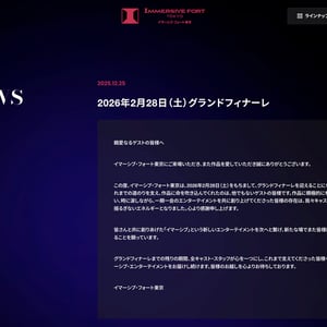 お台場の都市型エンターテインメント施設「イマーシブ・フォート東京(IMMERSIVE FORT TOKYO)」が2026年2月28日をもって閉館すると発表した。同施設はパレットタウンにあった「ヴィーナスフォート(VenusFort)」を居抜きで屋内型テーマパークに改修。2024年3月に開業し、約2年で運営を終了することとなる。 このコンテンツは FASHIONSNAP が配信しています。
