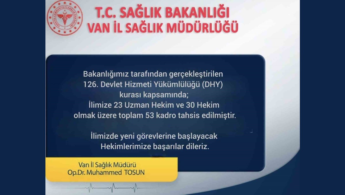 Sağlık Bakanlığı tarafından gerçekleştirilen 126. Dönem Devlet Hizmet Yükümlülüğü (DHY) Kurası kapsamında Van'a 23 uzman hekim ve 30 pratisyen hekim olmak üzere toplam 53 doktor ataması yapıldı.