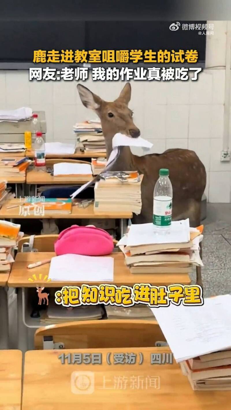中國四川一所高中上演一起離奇又逗趣的校園景象,一隻小鹿竟闖進教室啃食學生的考卷與作業本,全過程被學生錄影並上傳網路,引發熱烈討論與爆笑回應。 根據《香港01》報導,事件...…