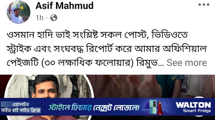 ফেসবুকে তিনি লিখেছেন, “ওসমান হাদি ভাই সংশ্লিষ্ট সব পোস্ট, ভিডিওতে স্ট্রাইক এবং সংঘবদ্ধ রিপোর্ট করে আমার অফিশিয়াল পেইজটি (৩০ লাখের বেশি ফলোয়ার) রিমুভ করে দেওয়া হয়েছে।”