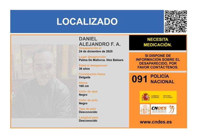 Daniel Alejandro F.A. quien desde el pasado miércoles, día de Nochebuena, estaba desaparecido, ha sido localizado con vida y en buen estado de salud, aunque ha sido trasladado a un centro hospitalario para someterle a un reconocimiento tras casi dos días sin noticias de su paradero, más cuando requería de una medicación específica. La Policía Local de Palma ha dado con el hombre, de 36 años de edad, del que se perdió la pista el día 24 de diciembre en la zona de s'Aranjassa.