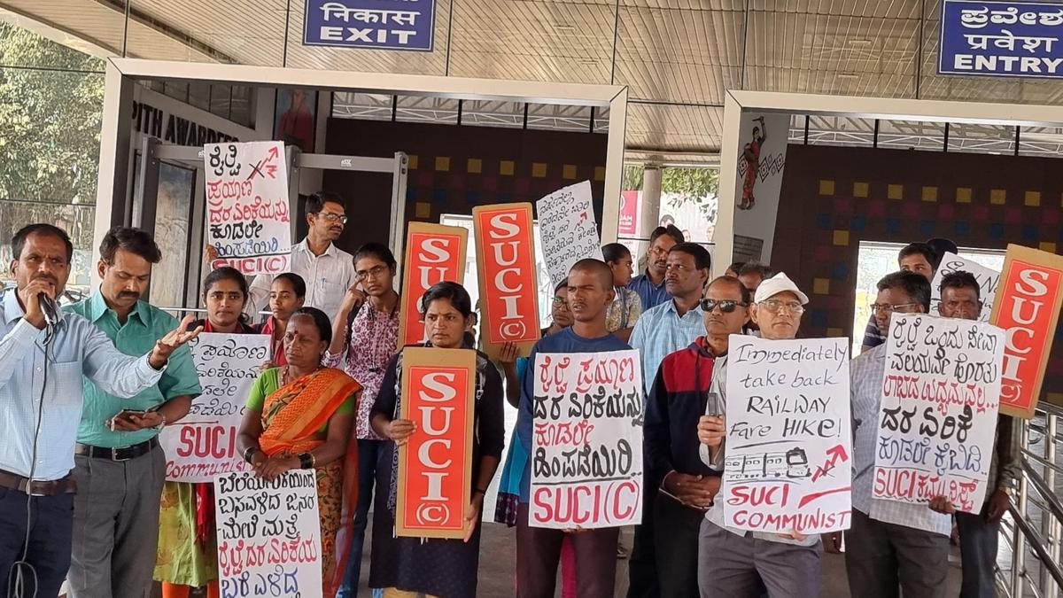 Socialist Unity Centre of India (Communist) members stage a demonstration in front of Dharwad Railway Station