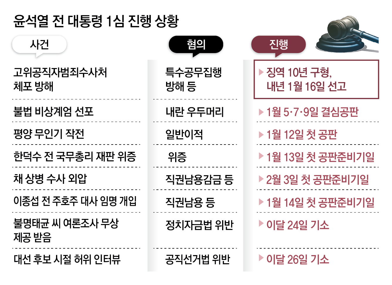 “국민이 부여한 권한을 아전인수 격으로 남용해 대한민국 법질서가 심각하게 훼손됐고 피고인을 대통령으로 선출한 국민들은 큰 상처를 입었다.”(내란특검 박억수 특검보) “국가비상사태를 발생시킨 원인은 거대 야당. 국민 깨우기 위해 그런 걸(계엄) 할 수밖에 없는 상황이었다.”(윤석열 전 대통령) 26일 오후 서울 서초구 서울중앙지법 서관 311호. 윤석열 전 대통령의 특수공무집행방해, 직권남용 권리행사 방해 등 혐의 결심공판에서 내란 특검(특별검사 조은석)은 징역 10년을 구형하며 윤 전 대통령을 강하게 질타했다. 윤 전 대통령은 약 1시간 동안 직접 최후진술에 나서 모든 혐의를 전면 부인했다.● “법치주의와 사법 질서 파괴한 중대 범죄” 이날 서울중앙지법 형사합의35부(부장판사 백대현) 심리로 열린 결심공판에서는 고위공직자범죄수사처(공수처)의 체포영장 집행을 방해한 혐의(특수공무집행방해 등), 국무위원 심의·의결권 침해 및 외신 허위 공보, 비화폰 현출 방해 혐의(직권남용 권