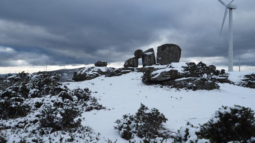 Imágenes del monte do Seixo que atestiguan el manto blanco que cubre la cumbre más alta de la sierra do Cando, situada en la provincia pontevedresa, (entre los ayuntamientos de Cerdedo-Cotobade, A Lama y Covelo). Alcanza una altitud de aproximadamente 967 metros, cuando este viernes la cota de nieve ha estado en los 500 metros. Es una zona expuesta a los vientos atlánticos, lo que ha propiciado la instalación de parques eólicos que hoy se erigen sobre la nevada naturaleza de esta sierra, que entre sus bellezas patrimoniales e históricas destacan el monolítico Portalén o la capilla de Santa Mariña.
