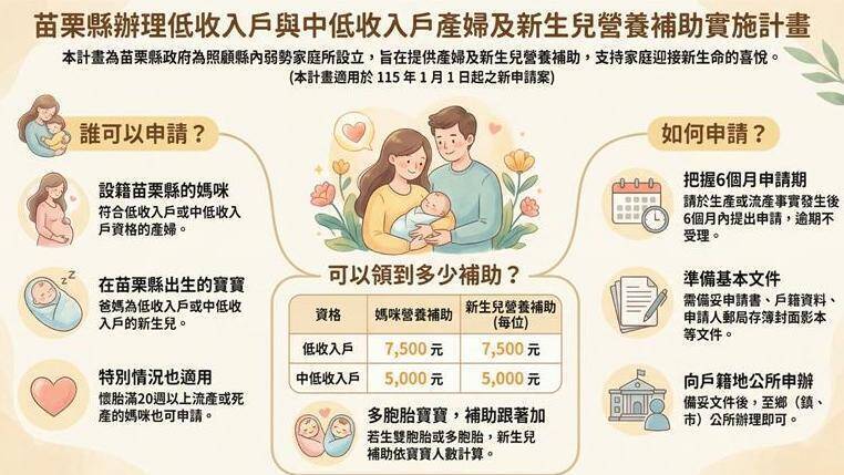 苗栗縣政府為因應近年物價上漲及育兒相關支出增加,並持續加強對弱勢家庭的照顧,已修正「低收入戶及中低收入戶產婦與新生兒營養補助實施計畫」,自明年元旦起實施,除提高額度,也簡化申請...…