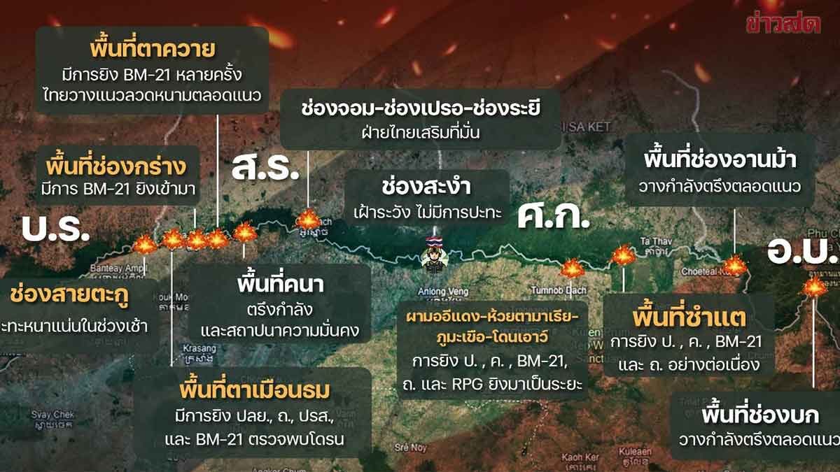 กองทัพภาคที่ 2 สรุปสถานการณ์ชายแดนไทย-กัมพูชา วันที่ 26 ธ.ค. ในหลายพื้นที่ยังตึงเครียด ศรีสะเกษปะทะหนัก ไทยคุมพื้นที่หลักได้ทั้งหมด 27 ธันวาคม 2568 – กองทัพภาคที่ 2 สรุปสถานการณ์ตามแนวชายแดนไทย–กัมพูชา วานนี้ ( 26 ธ.ค.68 ) ยังคงมีความตึงเครียดหลายจุด โดยเฉพาะในพื้นที่จังหวัดศรีสะเกษ ซึ่งเกิดการปะทะด้วยอาวุธยิงสนับสนุนอย่างต่อเนื่อง ขณะที่กองกำลังฝ่ายไทย ยังสามารถควบคุมพื้นที่ยุทธศาสตร์สำคัญไว้ได้ ส่วน ชายแดนจังหวัดอุบลราชธานี พื้นที่ช่องบกและช่องอานม้า ฝ่ายไทยวางกำลังตรึงตลอดแนว พร้อมเร่งสร้างที่กำบังแข็งแรงในจุดยุทธศาสตร์สำคัญ รวมถึงดำเนินการเคลียร์และทำลายบังเกอร์ของฝ่ายกัมพูชา เพื่อสถาปนาความมั่นคงในพื้นที่ ด้าน ชายแดนจังหวัดศรีสะเกษ หลายพื้นที่เกิดการปะทะหนาแน่น โดยเฉพาะแนวซำแต–โดนตวล–ภูผี–สัตตะโสม–พนมประสิทธิโส–ช่องตาเฒ่า ฝ่ายกัมพูชาใช้อาวุธยิงสนับสนุนหลายประเภทเป็นระยะ ขณะที่ฝ่ายไทยใช้อาวุธยิงสนับสนุนและโดรนตอบโต้ทันที ไม่พบการรุกภาคพื้นขนาดใหญ่ช่วงค่ำตรวจพบขบวนรถฝ่ายกัมพูชาจำนวน 5 คัน และถูกฝ่ายไทยใช้อาวุธยิงสนับสนุนทำลาย สำหรับพื้นที่ ผามออีแดง-ห้วยตามาเรีย นับเป็นจุดปะทะหลักของวัน มีการยิงปืนใหญ่ตั้งแต่เช้ามืดต่อเนื่องตลอดวัน ฝ่ายกัมพูชาใช้จรวด BM-21 ยิงเข้ามา ขณะที่ฝ่ายไทยยิงตอบโต้ ทำลายที่ตั้งอาวุธยิงสนับสนุนของฝ่ายตรงข้าม มีกำลังพลฝ่ายไทยได้รับบาดเจ็บจากสะเก็ด แต่ยังคงควบคุมพื้นที่ไว้ได้ กองทัพภาคที่ […]