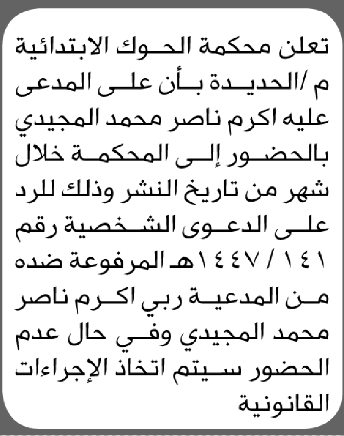 تعلن محكمة الحوك أن على المدعى عليه أكرم ناصر المجيدي الحضور إلى المحكمة