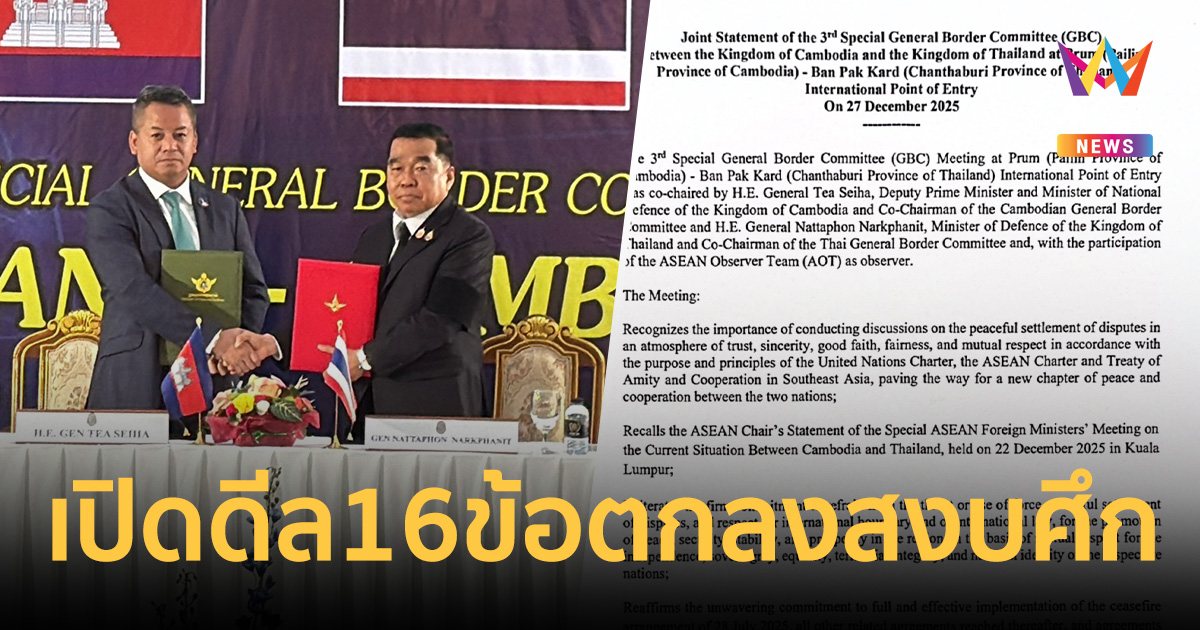 เปิดดีลสงบศึก! 16 ข้อตกลง GBC ไทย-กัมพูชา หยุดยิงเที่ยงวันนี้ ห้ามเคลื่อนย้ายกำลัง-ร่วมกู้ทุ่นระเบิด หลังหยุดยิง 72 ชั่วโมง ไทยจะส่งตัว 18 เชลยคืน
