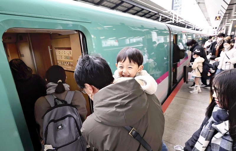 Passengers board a Shinkansen bullet train at JR Tokyo Station on Saturday as many head home for the year-end and New Year’s holidays. “I’m worried about my parents, as they experienced the powerful earthquake [on Dec. 8],” said a 45-year-old woman from Edogawa Ward, Tokyo, heading to her parents’ home in Misawa, Aomori Prefecture.