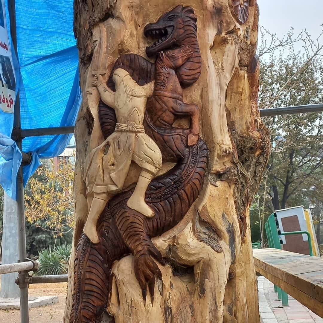 چند ماهی میشود تنه درخت خشک بوستان میعاد در حصار داربستهای فلزی قرار گرفته و روی آن طرحهایی از نبرد رستم و اژدها، خان سوم رستم، نقشه ایران و سرودههای فردوسی توسط حسین فرزان، هنرمند پیکرتراش نقش بسته است.