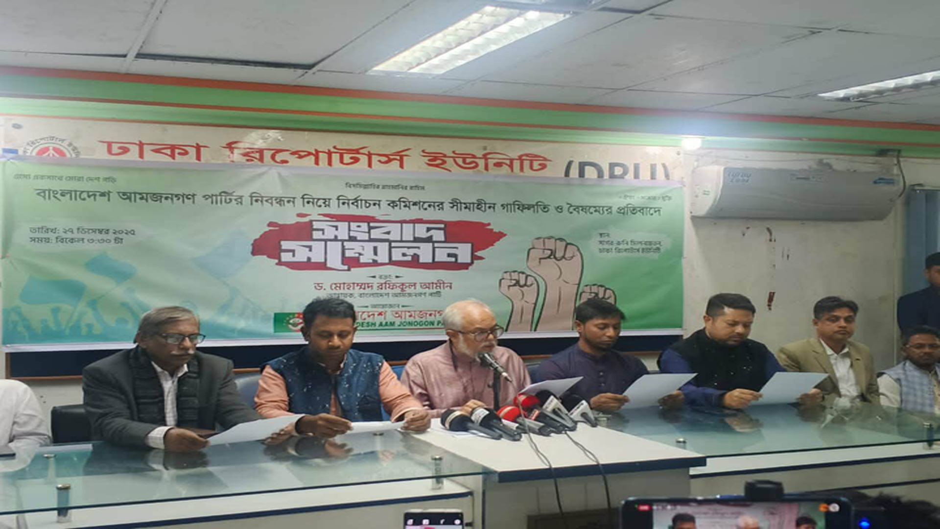 নিবন্ধন ইস্যুতে নির্বাচন কমিশন অন্যায় আচরণ করছে বাংলাদেশ আমজনগণ পার্টির প্রতি-এমন অভিযোগ করেছেন দলের আহ্বায়ক ড. মোহাম্মদ রফিকুল আমীন।শনিবার (২৭ ডিসেম্বর) ঢাকা রিপোর্টার্স ইউনিটিতে সংবাদ সম্মেলন করে এ কথা বলেন তিনি। সংবাদ সম্মেলনে বাংলাদেশ আমজনগণ পার্টির আহ্বায়ক বলেন, আমাদের দলের বিরুদ্ধে নির্বাচন কমিশনে (ইসি) জমা অভিযোগ বেনামি ও পরিকল্পিত। আইন বহির্ভূতভাবে গোয়ান্দা সংস্থা দিয়ে তদন্ত করা হয়েছে। ফ্যাসিস্ট স্বৈরাচারী আওয়ামী লীগ সরকারের ধারাবাহিকতা থেকে বের হতে পারেনি কমিশন-এ কথা জানিয়ে তিনি আরও বলেন, অতীতের জালিমের ভূমিকা থেকে সরে আসতে পারেনি তারা। অংশগ্রহণমূলক নির্বাচন চায় না তারা। আরও পড়ুন: প্রায় ৩ লাখ প্রবাসীর কাছে পাঠানো হয়েছে পোস্টাল ব্যালট: ইসি অদৃশ্য শক্তির প্রভাবে নির্বাচন কমিশন আমজনগণ পার্টির নিবন্ধন ইস্যুতে নীরব ভূমিকা পালন করছে বলেও জানান তিনি। নিরপেক্ষ থেকে দায়িত্ব পালন করে আজ-কালের মধ্যে চূড়ান্ত নিবন্ধন সনদ প্রদানের আহ্বান জানিয়ে তিনি মনোনয়নপত্র জমাদানের জন্য সময় দেয়ার অনুরোধ করেন। নির্বাচন কমিশন চরম আস্থাহীনতা ও সিদ্ধান্তহীনতা দেখিয়েছে। নিবন্ধনের বিষয়ে চাপের কাছে নতি স্বীকার করা নির্বাচন কমিশন সংসদ নির্বাচন ও গণভোট আয়োজন করতে পারবে কিনা সে বিষয়ে প্রশ্ন আছে বলেও মনে করেন তিনি।