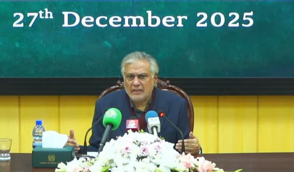 پاکستان کے وزیر خارجہ اسحاق ڈار نے 27 دسمبر 2025 کو دفتر خارجہ میں پریس بریفنگ کی (سکریب گریب/ دفتر خارجہ)